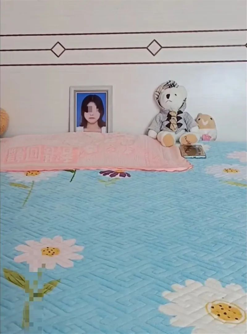 刘某怡父母将她的遗像和生前玩具一起放在床头。