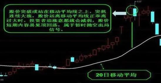2、股价突破或站在移动平均线之上,突然连续大涨,股价远离移动平均线正乖离过大时,投资者追涨意愿就会下降,股价有可能短期见顶回落,属于卖出信号。
